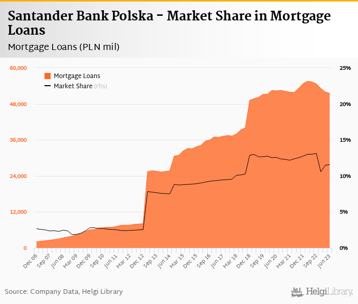 Santander Bank Polska accounted for 11.6% of all mortgage loans issued in Poland at the end of 2Q2023. Historically, the bank’s market share in mortgage loans reached an all time high of 13.1% in 3Q2022 and an all time low of 1.85% in 4Q2008.