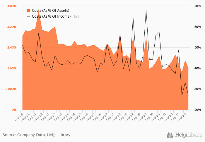 Historically, the bank’s costs reached an all time high of 67.8% of income in 1Q2020 and an all time low of 26.8% in 2Q2023.