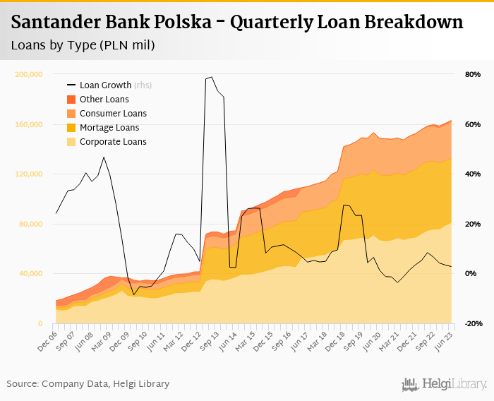 Santander Bank Polska's loans reached PLN 162,939 mil in the second quarter of 2023, up from PLN 160,624 mil when compared to the previous quarter and up from PLN 158,390 mil when compared to the same period of last year. Historically, the bank’s loans reached an all time high of PLN 162,939 mil in 2Q2023 and an all time low of PLN 18,266 mil in 4Q2006.