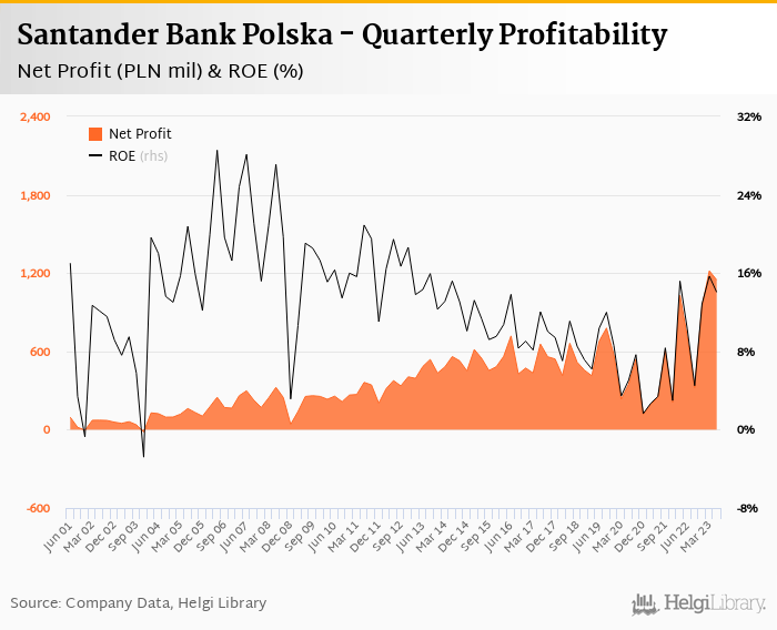Historically, the bank’s net profit reached an all time high of PLN 1,217 mil in 1Q2023 and an all time low of PLN -18.1 mil in 4Q2003. The average profit in the last six quarters amounted to PLN 896 mil.