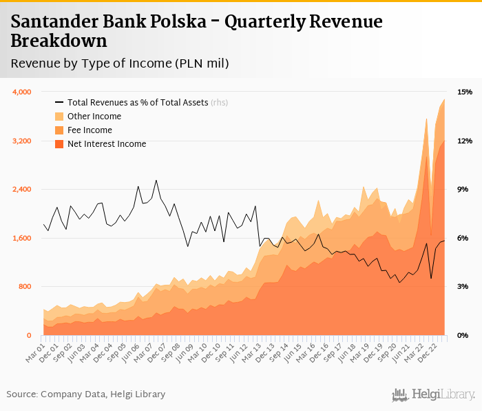 Historically, the bank’s revenues containing of interest, fee and other non-interest income reached an all time high of PLN 3,839 mil in 2Q2023 and an all time low of PLN 384 mil in 2Q2001. The average revenue in the last six quarters amounted to PLN 3,287 mil.