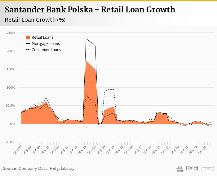 Santander Bank Polska's retail loans reached PLN 80,875 mil at the end of 2023-06-30, up 0.273% compared to the previous year. In the last decade, the average annual loan growth amounted to 8.88%.