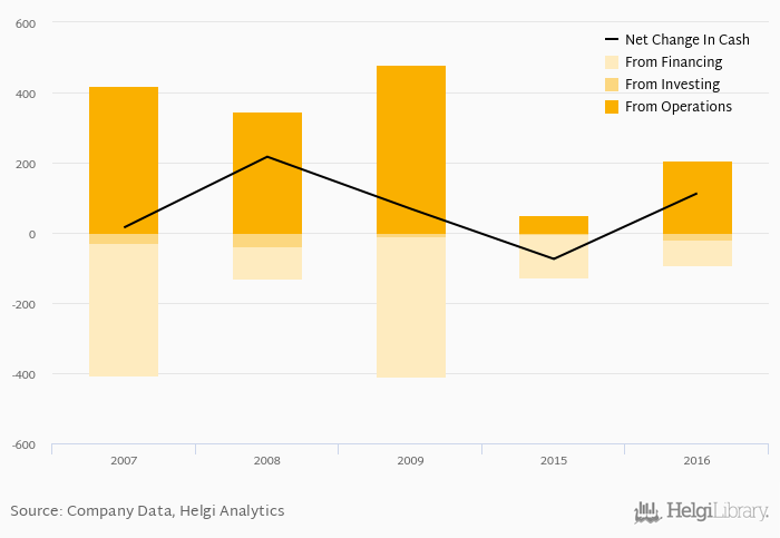 Cash from financing amounted to CZK -75.0 mil, so the company generated CZK 113 mil net cash in 2016.
