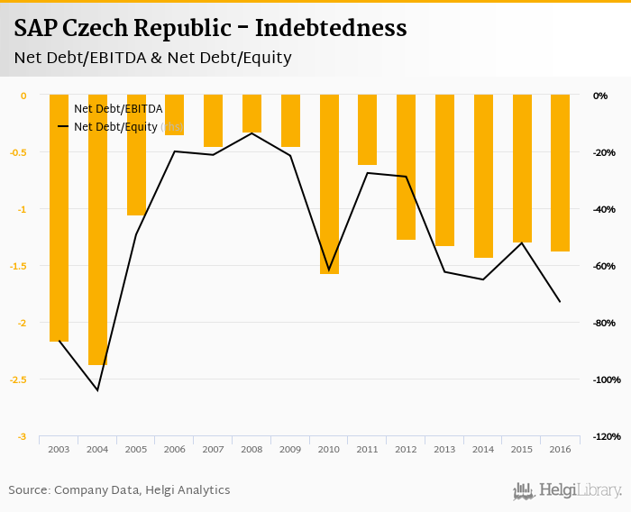 SAP Czech Republic's net debt stood at CZK -265 mil and accounted for -73.1% of equity at the end of 2016. The ratio is down 20.9 pp compared to the previous year.