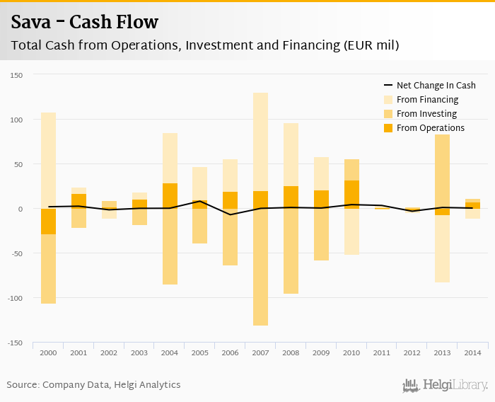 Sava's operating cash flow stood at EUR 6.97 mil in 2014, up 197% when compared to the previous year. Historically, between 2000 - 2014, the firm’s operating cash flow reached a high of EUR 31.9 mil in 2010 and a low of EUR -28.6 mil in 2000.