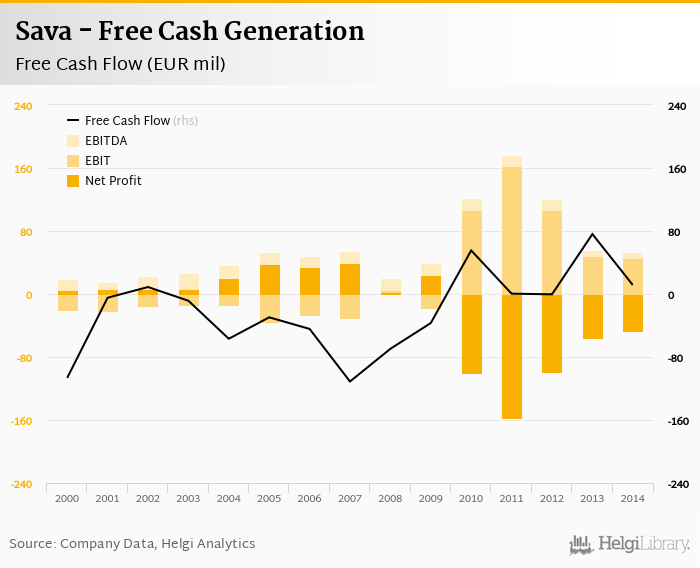 Sava made a net profit of EUR -47.0 mil with revenues of EUR 63.0 mil in 2014, up by 15.5% and down by 6.25%, respectively, compared to the previous year. This translates into a net margin of -74.5%.