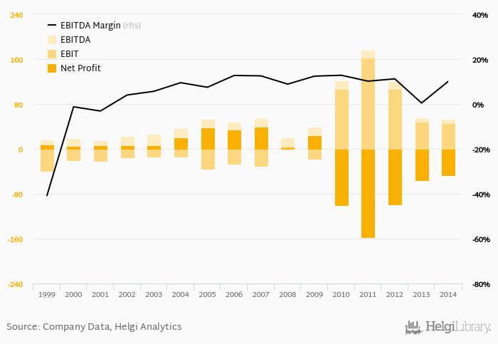 Historically, between 1999 - 2014, the firm’s net profit reached a high of EUR 39.3 mil in 2007 and a low of EUR -157 mil in 2011. Since 2009, the firm's net profit has decreased 299% or nan% a year on average.