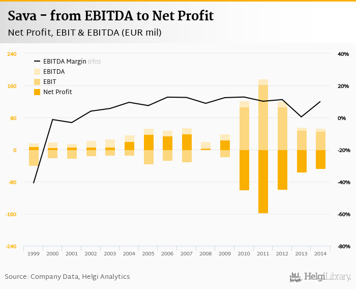 Sava made a net profit of EUR -47.0 mil with revenues of EUR 63.0 mil in 2014, up by 15.5% and down by 6.25%, respectively, compared to the previous year. This translates into a net margin of -74.5%.