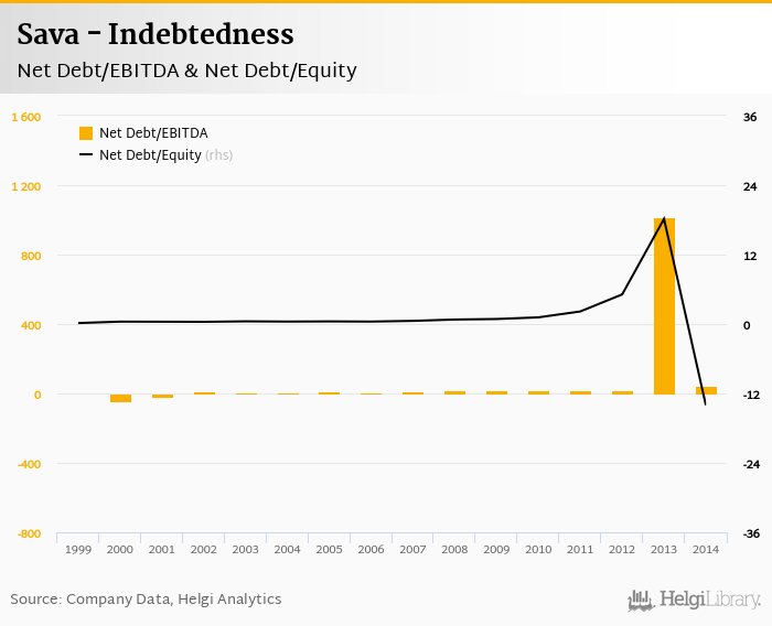 Sava's net debt stood at EUR 298 mil and accounted for -14.0 of equity at the end of 2014. The ratio is down 32.2 pp compared to the previous year.