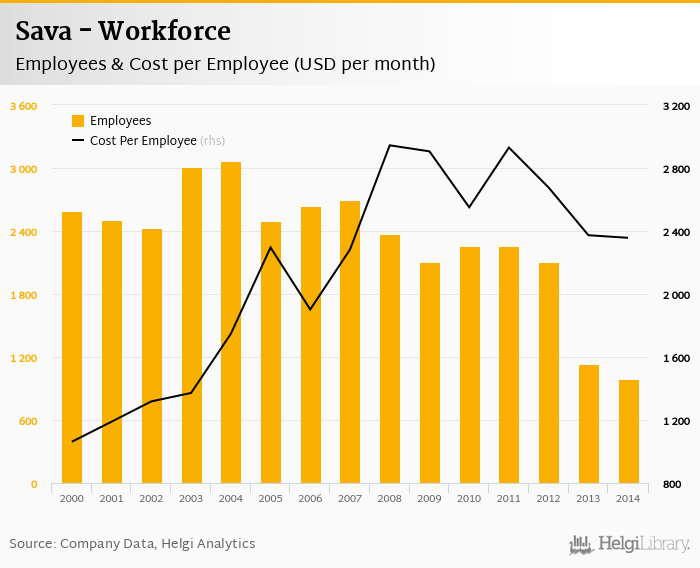 Sava employed 990 employees in 2014, down 12.3% compared to the previous year. Historically, between 2000 and 2014, the firm's workforce hit a high of 3,062 employees in 2004 and a low of 990 employees in 2014.