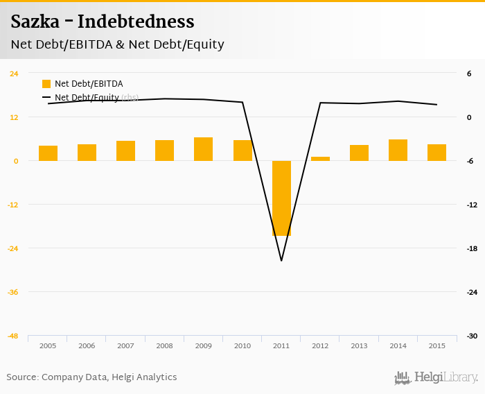 Sazka's net debt stood at CZK 7,605 mil and accounted for 1.63 of equity at the end of 2015. The ratio is down 0.476 pp compared to the previous year.