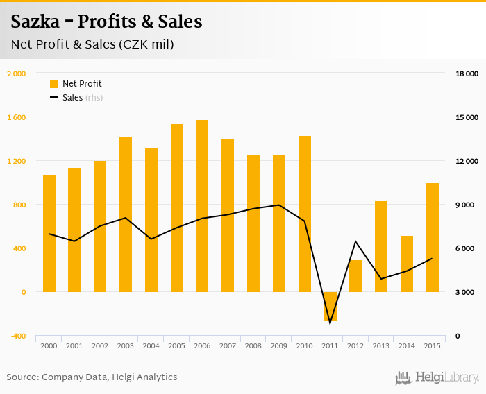 Historically, between 2000 and 2015, the company’s net profit reached a high of CZK 1,576 mil in 2006 and a low of CZK -267 mil in 2011. Over the last decade the firm's net profit decreased by an average of 4.25% a year.
