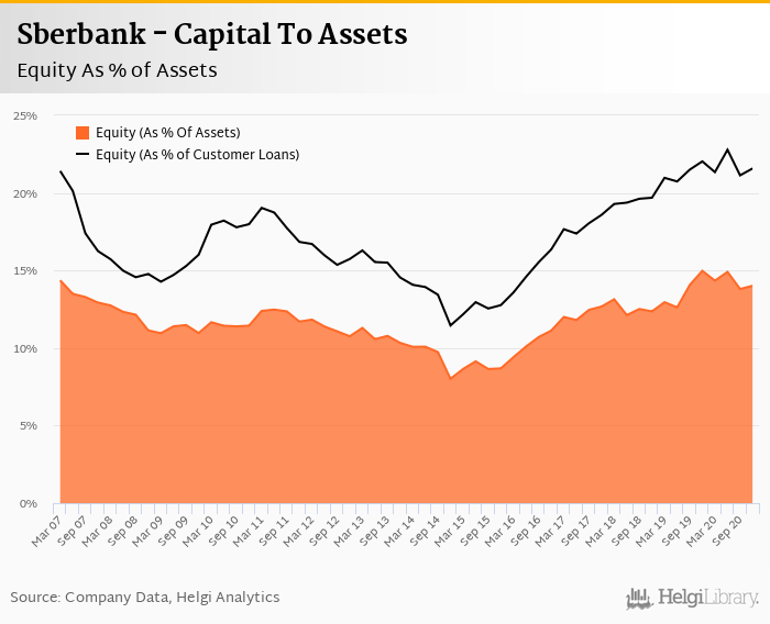 Sberbank's Equity reached 14.0% of total assets in the 4Q2020, down from 15.0% for the previous year. As a share of net customer loans, the ratio amounted to 21.6% at the end of the fourth quarter of 2020.
