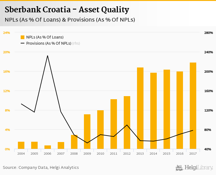 Sberbank Croatia's non-performing loans reached 17.9% of total loans at the end of 2017, up from 16.0% compared to the previous year. Historically, the NPL ratio hit an all time high of 17.9% in 2017 and an all time low of 0.742% in 2006.