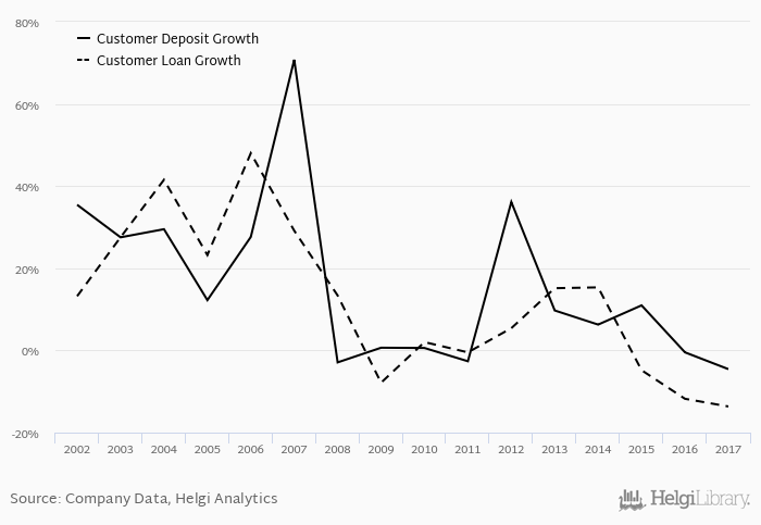 On the other hand, bank's customer deposit growth amounted to -4.55% at the end of 2017, down from -0.467% when compared to the previous year. Historically, the bank’s deposit growth reached an all time high of 70.7% in 2007 and an all time low of -4.55% in 2017. In the last decade, the average annual loan growth amounted to 4.82%.