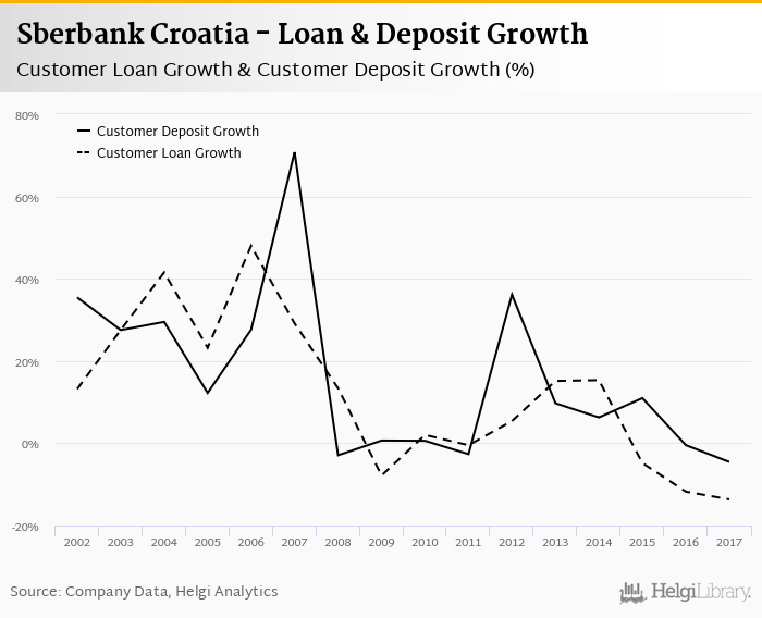 Sberbank Croatia's customer loan growth reached -13.6% in 2017, down from -11.8% compared to the previous year. Historically, the bank’s loans growth reached an all time high of 48.0% in 2006 and an all time low of -13.6% in 2017. In the last decade, the average annual loan growth amounted to 0.745%.