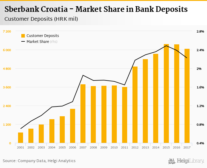 Sberbank Croatia accounted for 2.22% of all customer deposits taken by banks in Croatia at the end of 2017. Historically, the bank’s market share in customer deposits reached an all time high of 2.49% in 2015 and an all time low of 0.704% in 2001.