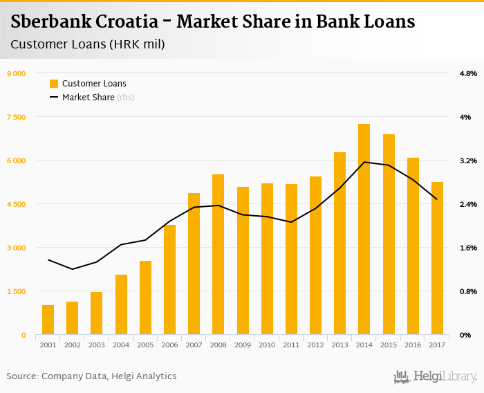 Sberbank Croatia accounted for 2.47% of all customer loans issued in Croatia at the end of 2017. Historically, the bank’s market share in customer loans reached an all time high of 3.16% in 2014 and an all time low of 1.19% in 2002.
