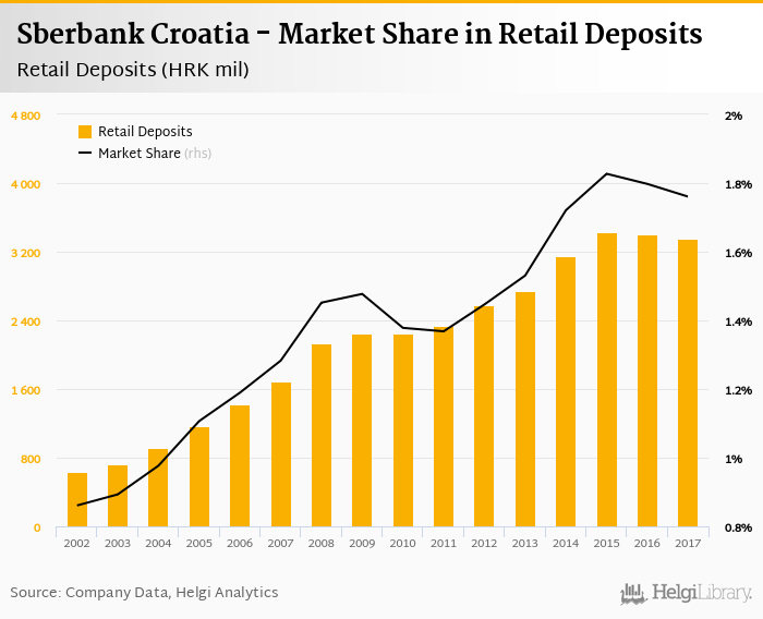 Sberbank Croatia accounted for 1.76% of all retail deposits taken by banks in Croatia at the end of 2017. Historically, the bank’s market share in retail deposits reached an all time high of 1.83% in 2015 and an all time low of 0.861% in 2002.