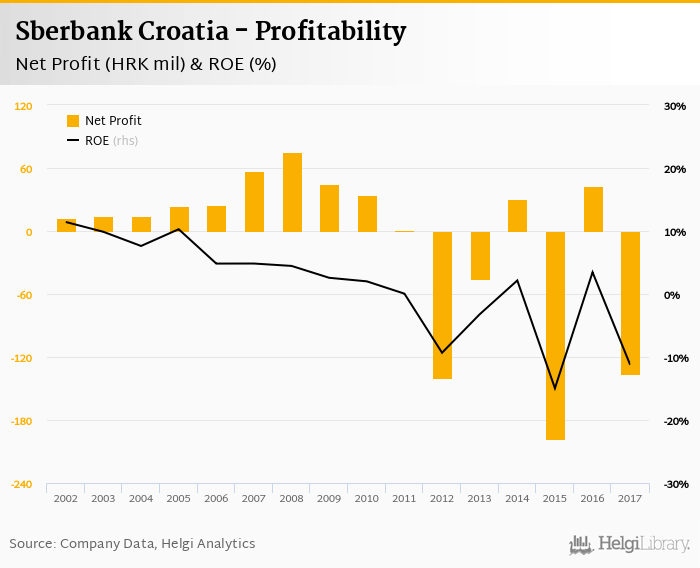 Sberbank Croatia made a net profit of HRK -136 mil in 2017, down 415% compared to the previous year. This implies a return on equity of -11.2%.