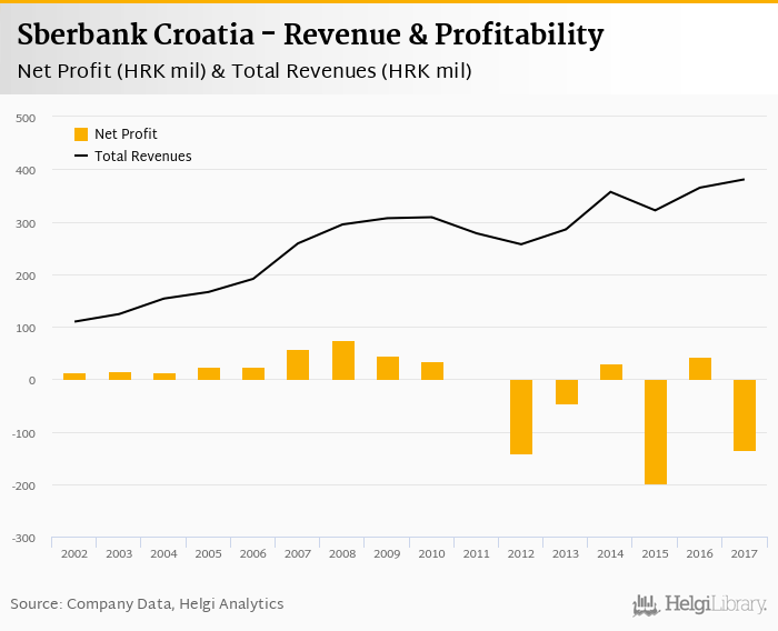 Sberbank Croatia made a net profit of HRK -136 mil under revenues of HRK 381 mil in 2017, up -415% and 4.35% respectively compared to the previous year.