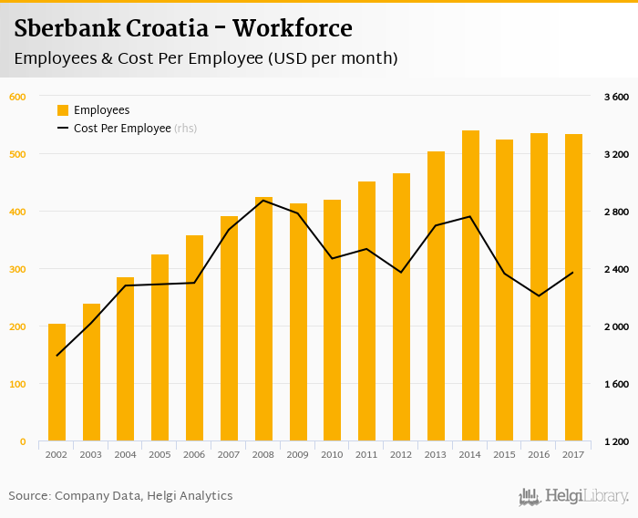 Sberbank Croatia employed 535 persons in 2017, down 0.187% when compared to the previous year. Historically, the bank's workforce hit an all time high of 542 persons in 2014 and an all time low of 205 in 2002.