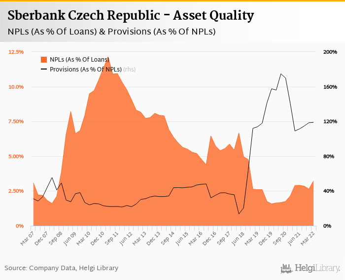 Comparing Sberbank Czech Republic with its closest peers, Ceska Sporitelna operated at the end of 2022-03-31 with NPL ratio of 2.10% and provision coverage of 109%, CSOB with 2.00% and 47.2% respectively and Komercni Banka had 2.43% of bad loans covered with 51.5% by provisions at the end of 2022-03-31.