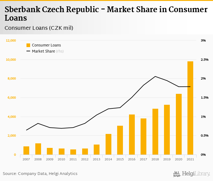Sberbank Czech Republic accounted for 1.78% of all consumer loans issued in Czechia at the end of 2021. Historically, the bank’s market share in consumer loans reached an all time high of 2.05% in 2018 and an all time low of 0.640% in 2007.