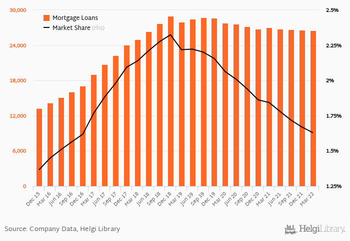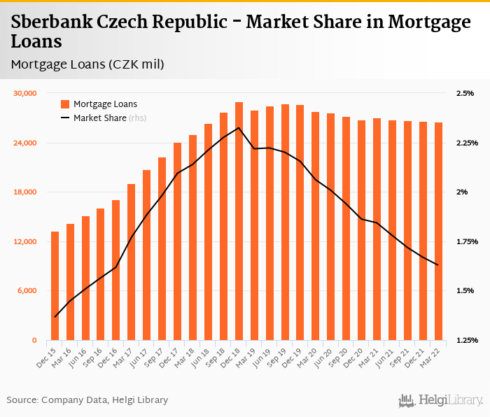 Sberbank Czech Republic accounted for 1.63% of all mortgage loans issued in Czechia at the end of 1Q2022. Historically, the bank’s market share in mortgage loans reached an all time high of 2.32% in 4Q2018 and an all time low of 1.37% in 4Q2015.