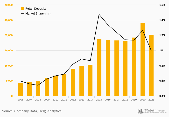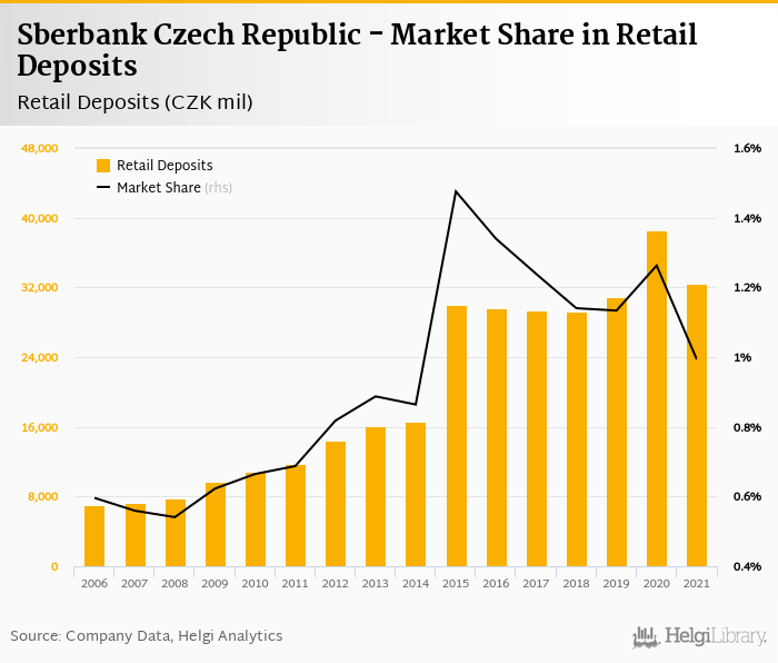 Sberbank Czech Republic accounted for 0.993% of all retail deposits taken by banks in Czechia at the end of 2021. Historically, the bank’s market share in retail deposits reached an all time high of 1.48% in 2015 and an all time low of 0.541% in 2008.