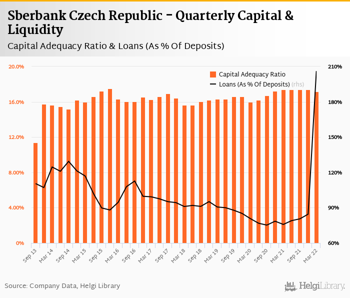 When compared to bank's main peers, Ceska Sporitelna ended the first quarter of 2022 with a capital adequacy ratio at 21.2% and loans to deposits of 63.5%, CSOB with 21.7% and 61.6% respectively and Komercni Banka some 20.2% in terms of capital adequacy and 70.2% of loans to deposits at the end of the first quarter of 2022.