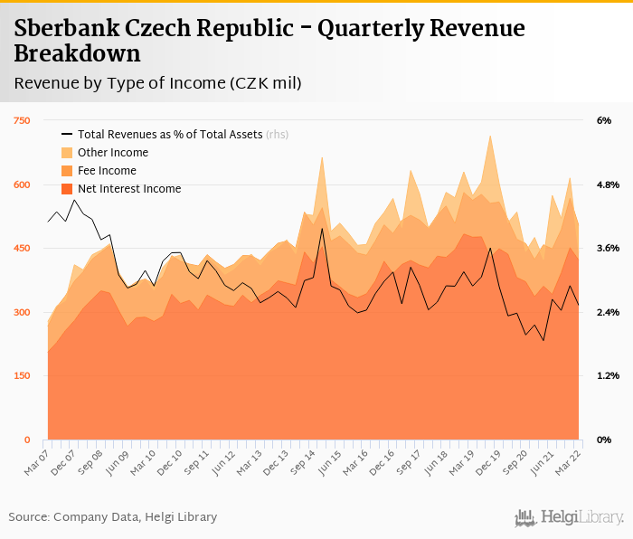 When compared to bank's main peers, Ceska Sporitelna generated total revenues of 2.74% of assets in 1Q2022 CSOB operated with 2.16% revenue margin and Komercni Banka produced total income worth 2.71% of assets.