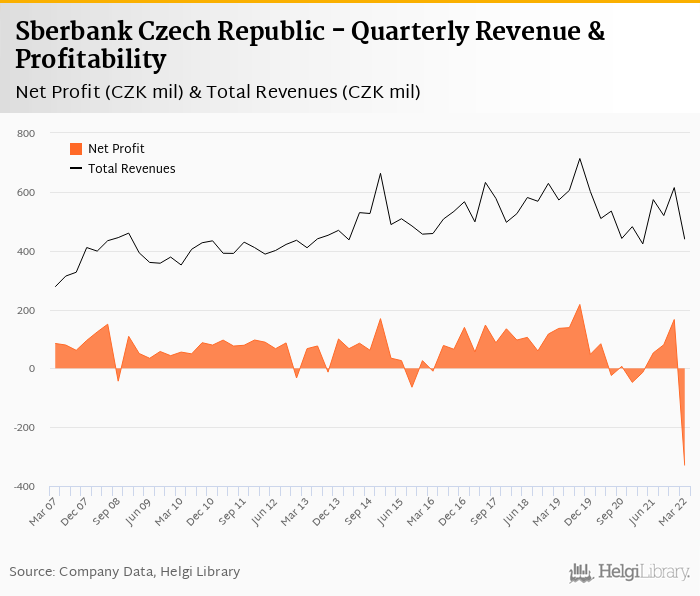Sberbank Czech Republic made a net profit of CZK -330 mil under revenues of CZK 439 mil in the first quarter of 2022, down 2% and up 3.66% respectively when compared to the same period last year.
