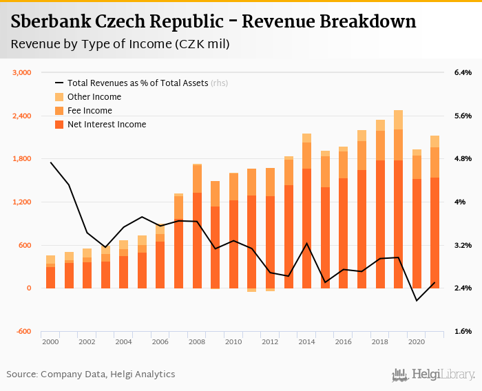 Comparing Sberbank Czech Republic with its closest peers, Ceska Sporitelna generated total revenues of 2.58% of assets in 2021, CSOB operated with 1.98% revenue margin and Komercni Banka produced total income worth 2.52% of assets.