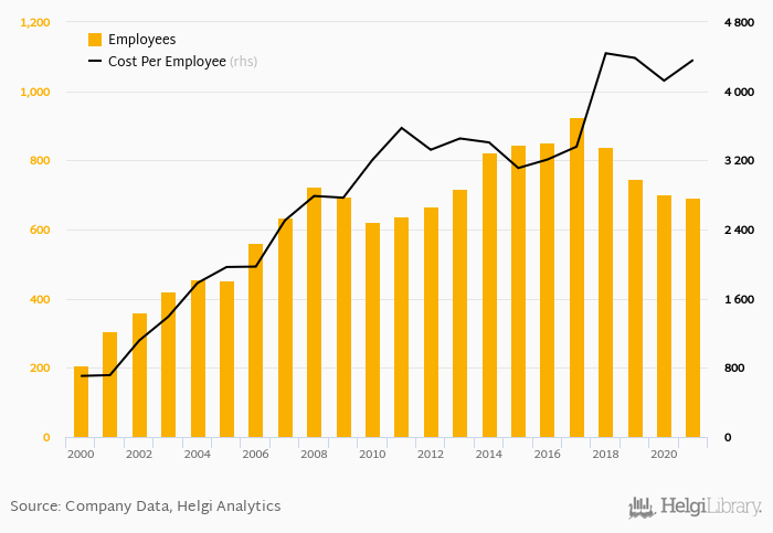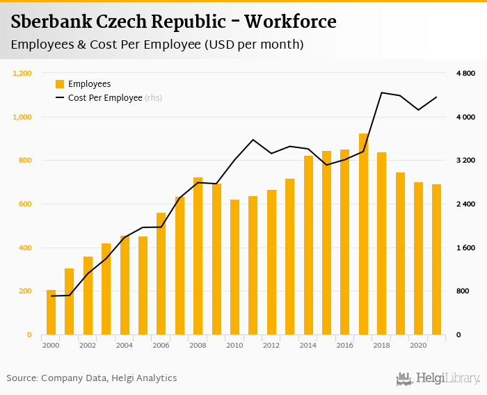 Sberbank Czech Republic employed 692 persons in 2021, down 1.28% when compared to the previous year. Historically, the bank's workforce hit an all time high of 924 persons in 2017 and an all time low of 208 in 2000.