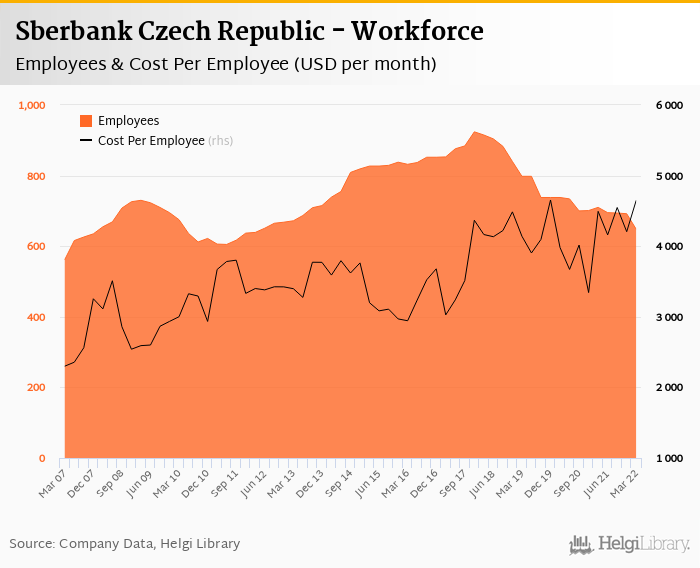 Comparing Sberbank Czech Republic with its closest peers, Ceska Sporitelna had 9,746 employees and 399 branches in 2022-03-31, CSOB operated with 8,077 people and 204 branches and Komercni Banka had a network of 240 branches with 7,564 employees in 2022-03-31.