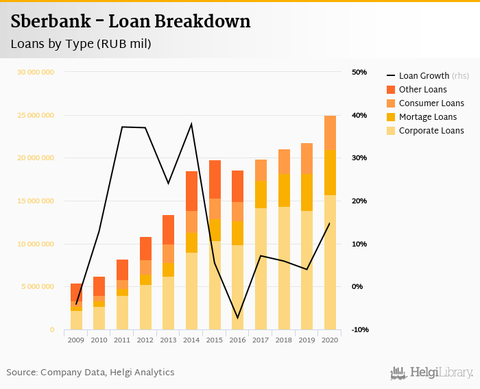 Sberbank's loans reached RUB 25,008,600 mil in the 2020, up from RUB 21,749,400 mil compared to the previous year. Historically, the bank’s loans reached an all time high of RUB 25,008,600 mil in 2020 and an all time low of RUB 5,443,840 mil in 2009.