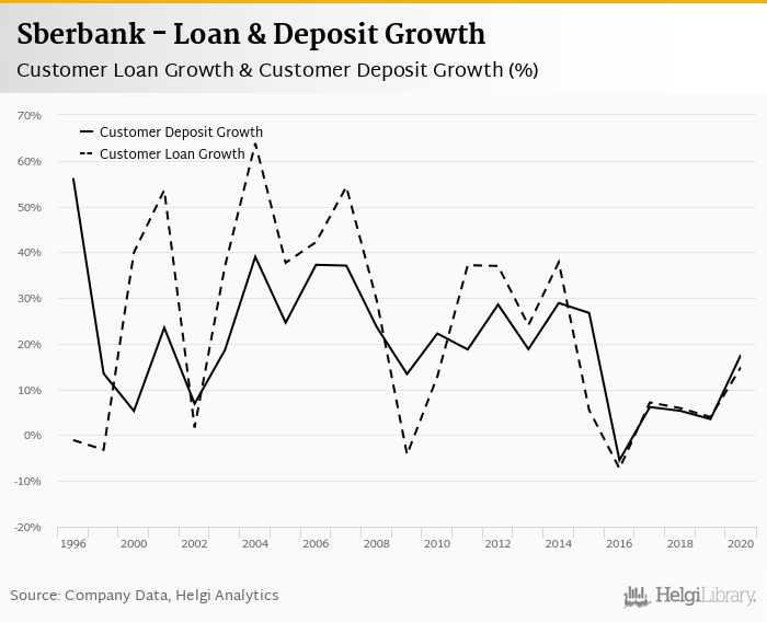 Sberbank's customer loan growth reached 14.8% in 2020, up from 3.97% compared to the previous year. Historically, the bank’s loans growth reached an all time high of 63.8% in 2004 and an all time low of -7.27% in 2016. In the last decade, the average annual loan growth amounted to 15.6%.