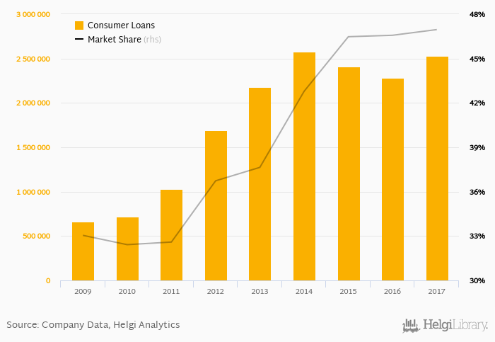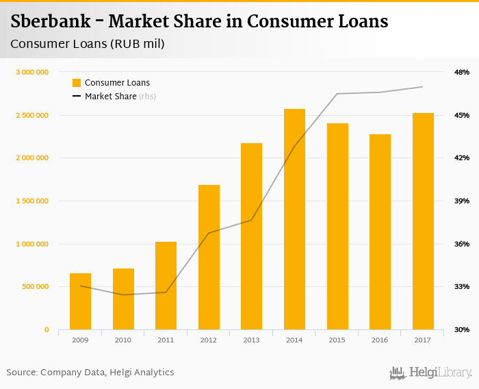 Sberbank accounted for 47.0% of all consumer loans issued in Russia at the end of 2017. Historically, the bank’s market share in consumer loans reached an all time high of 47.0% in 2017 and an all time low of 32.4% in 2010.