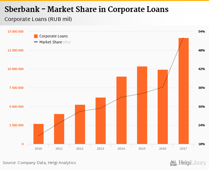 Sberbank accounted for 52.1% of all corporate loans issued in Russia at the end of 2017. Historically, the bank’s market share in corporate loans reached an all time high of 52.1% in 2017 and an all time low of 20.6% in 2010.