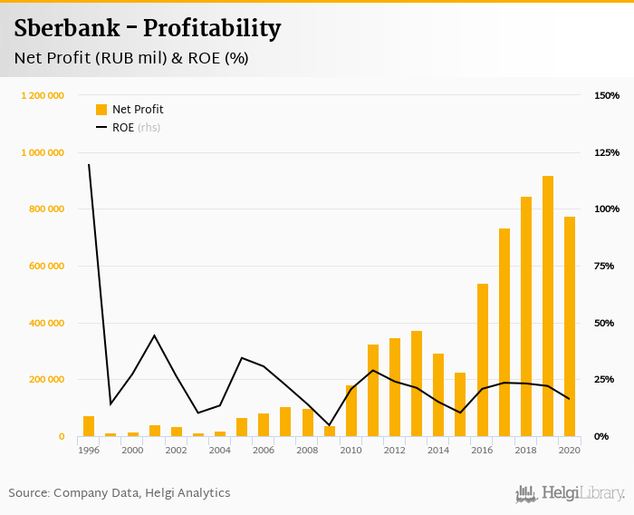 Sberbank made a net profit of RUB 776,280 mil in 2020, down 15.7% compared to the previous year. This implies a return on equity of 16.3%.