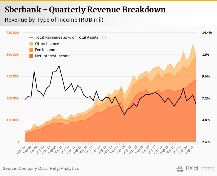 Historically, the bank’s revenues containing of interest, fee and other non-interest income reached an all time high of RUB 665,400 mil in 3Q2020 and an all time low of RUB 69,162 mil in 1Q2007. The average revenue in the last six quarters amounted to RUB 593,533 mil.