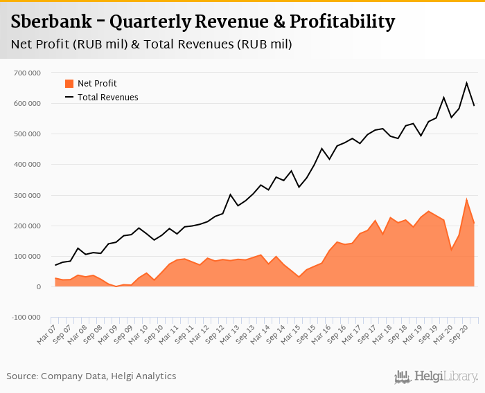 On the other hand, bank’s revenues amounted to an all time high of RUB 665,400 mil in 3Q2020 and an all time low of RUB 69,162 mil in 1Q2007. The average revenues in the last six quarters reached RUB 593,533 mil.