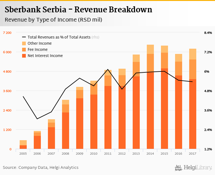 Comparing Sberbank Serbia with its closest peers, Komercijalna Banka Beograd generated total revenues of 5.43% of assets in 2017, Bank Intesa Serbia operated with 5.33% revenue margin and Raiffeisenbank Serbia produced total income worth 5.87% of assets.