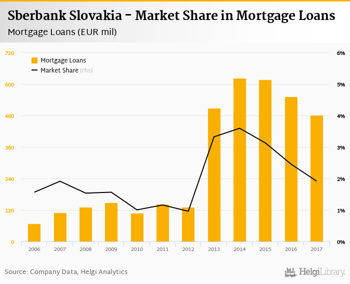 Sberbank Slovakia accounted for 1.92% of all mortgage loans issued in Slovakia at the end of 2017. Historically, the bank’s market share in mortgage loans reached an all time high of 3.59% in 2014 and an all time low of 0.960% in 2012.