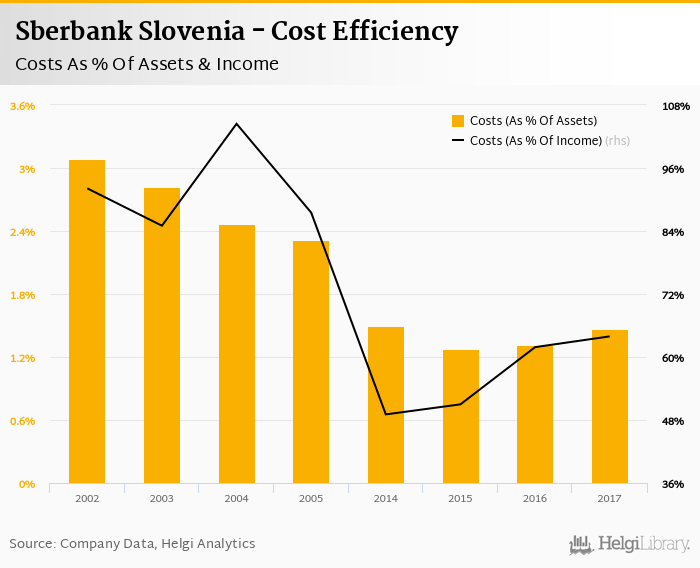 Comparing Sberbank Slovenia with its closest peers, NKBM Group operated in 2017 with a cost to income ratio of 83.3% in 2017, and SKB Banka reached 52.6%.