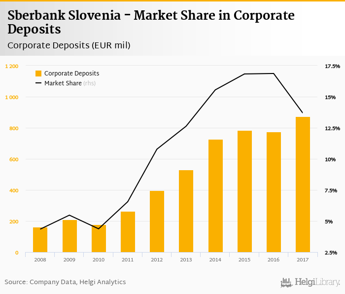Sberbank Slovenia accounted for 13.7% of all corporate deposits taken by banks in Slovenia at the end of 2017. Historically, the bank’s market share in corporate deposits reached an all time high of 16.9% in 2016 and an all time low of 4.34% in 2008.