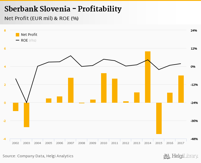 Comparing Sberbank Slovenia with its closest peers, Nova Ljubljanska banka generated a net profit of EUR 225 mil with ROE of 14.3% in 2017, NKBM Group netted EUR 47.8 mil (ROE of 6.93%) and SKB Banka announced a net profit of EUR 43.4 mil implying ROE of 11.4%.