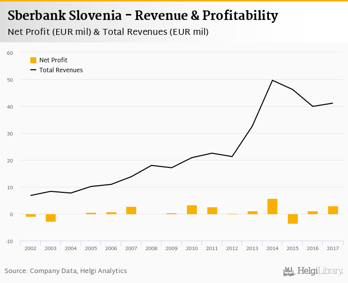 Comparing Sberbank Slovenia with its closest peers, Nova Ljubljanska banka generated a net profit of EUR 225 mil with revenues of EUR 489 mil in 2017, NKBM Group netted EUR 47.8 mil (revenues of EUR 143 mil) and SKB Banka announced a net profit of EUR 43.4 mil (revenues of EUR 111 mil).