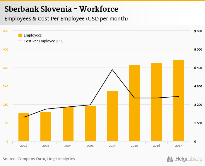 Sberbank Slovenia employed 354 persons in 2017, up 3.51% when compared to the previous year. Historically, the bank's workforce hit an all time high of 354 persons in 2017 and an all time low of 124 in 2002.